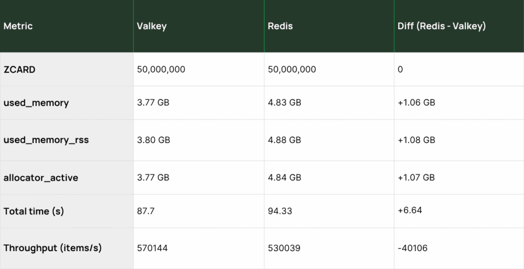 Valkey 8.1 uses 28% less memory than Redis 8.2 in our 50M sorted set benchmark. See the throughput and memory data from real-world hyperscale testing.