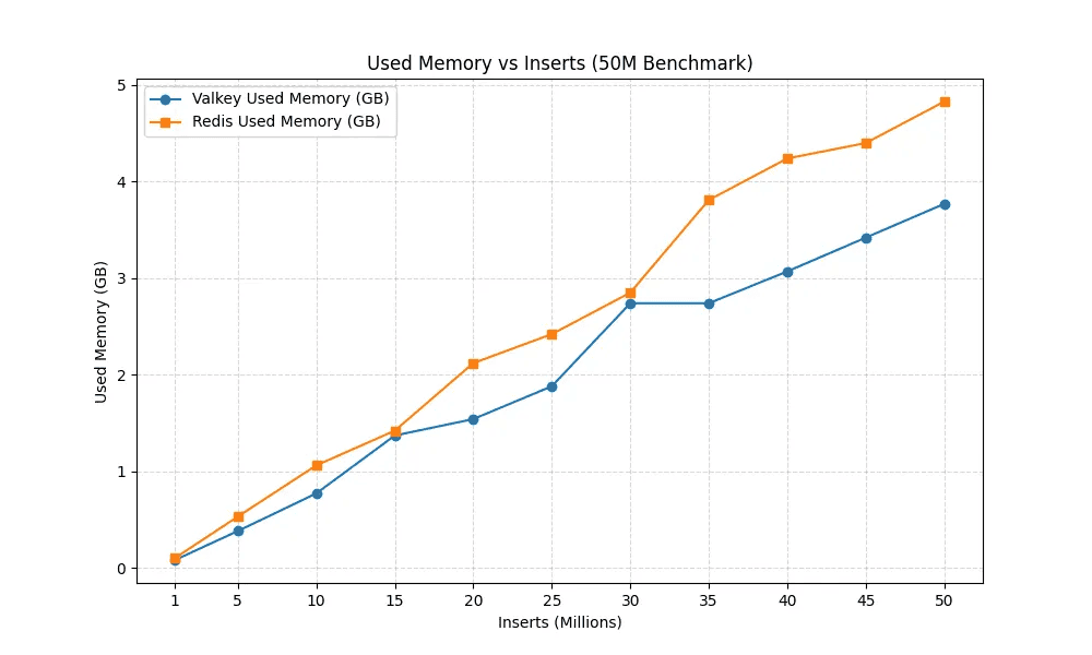 From the start, Valkey was more frugal. At 1 M inserts, Valkey used ~80 MB of memory while Redis used ~100 MB. By the time we reached 50 M entries, Valkey consumed 3.77 GB whereas Redis consumed 4.83 GB, a difference of 1.06 GB (28 %). That reduction aligns with Valkey’s per‑key overhead savings and the Linux Foundation’s claim that upgrading to Valkey 8.1 can reduce memory footprints by up to 20 % for most workloads. Throughput told a similar story: Redis initially led, but Valkey held steady and finished the run at ~570 k inserts/s while Redis dropped to ~530 k/s, a ~7 % difference.